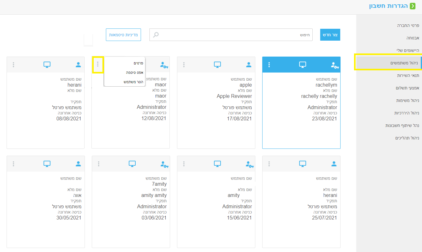כעת מוצגים כל משתמשי המערכת הקיימים תחת החשבון שלנו, לחיצה על שלוש הנקודות לצד המשתמש תציג את הפעולות שניתן לבצע עבורו.