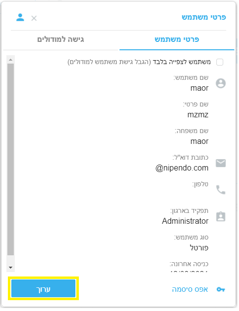 על מנת לערוך משתמש נלחץ על "פרטים" ואז על כפתור "ערוך" המופיע בחלון "פרטי משתמש" שנפתח עבורנו ולסיום "שמור".