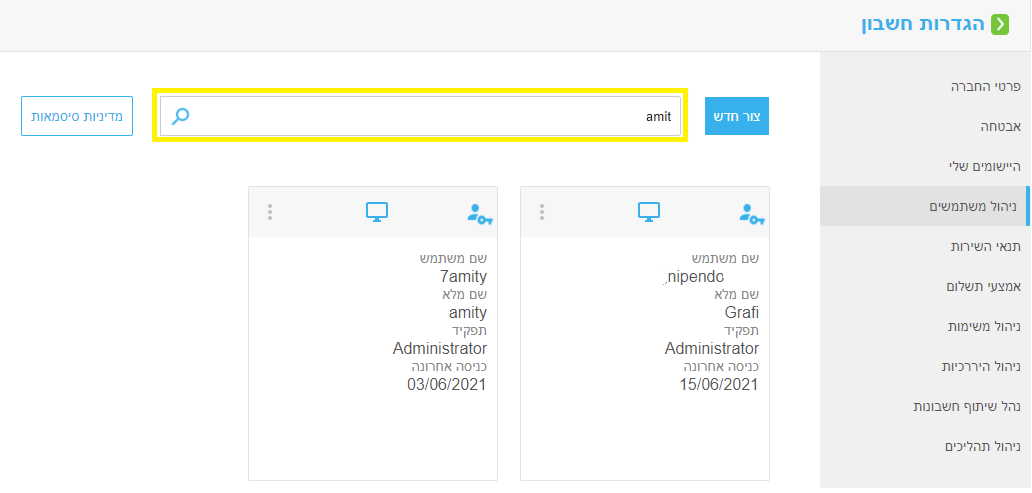 לכניסה לסביבת "ניהול משתמשים" על מנהל המערכת לחץ על החץ בצידו השמאלי של המסך לצד שם החברה.