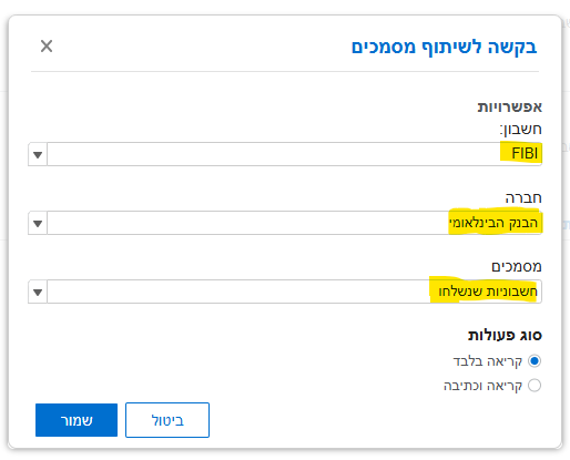 עליו לבחור בתפריט הלבן מימין בלשונית "שיתוף חשבונות"> "שיתוף על ידי"> "שתף מסמכים"