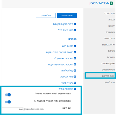 שלב 1: הגדרת כתובת מייל לשליחת חשבוניות