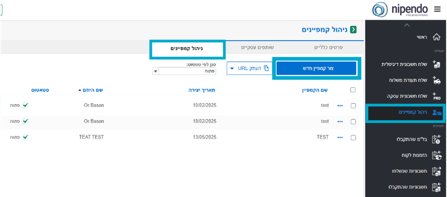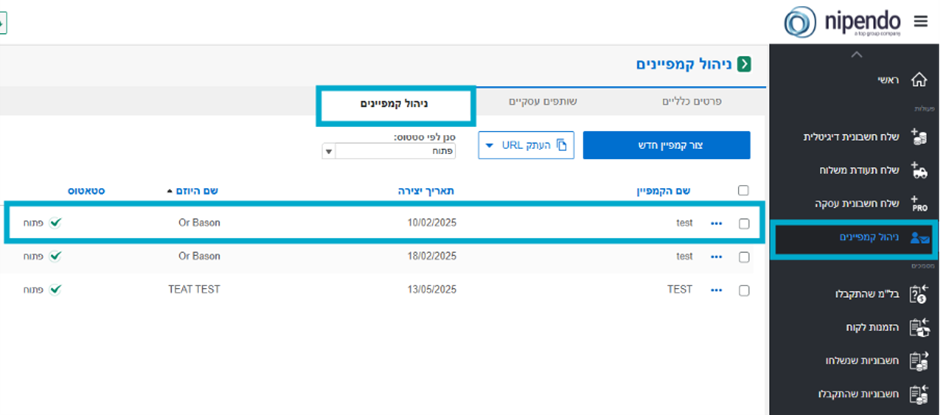 2. בתפריט הימני (הצבע השחור), חפשו את הלשונית "ניהול קמפיינים".