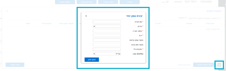 הזינו את נתוני החובה של הספק (שם חברה, מייל, טלפון וכו')
