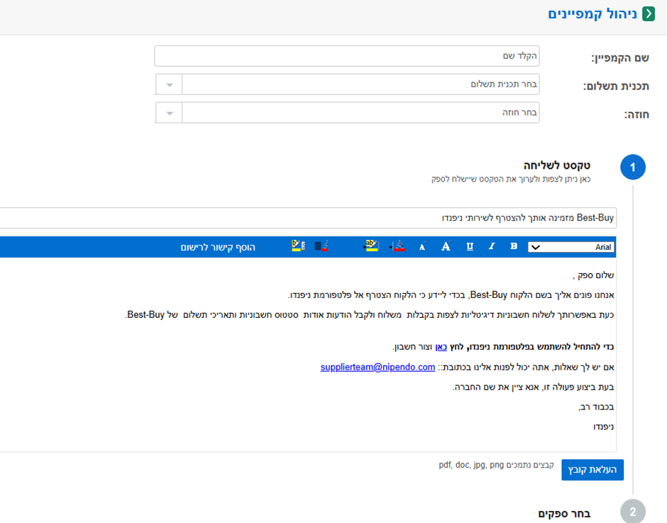 במסך זה גם נוכל להגדיר את ההודעה שתגיע לספקים אותם אנו מחברים ולצרף קבצים רלונטים לקמפיין