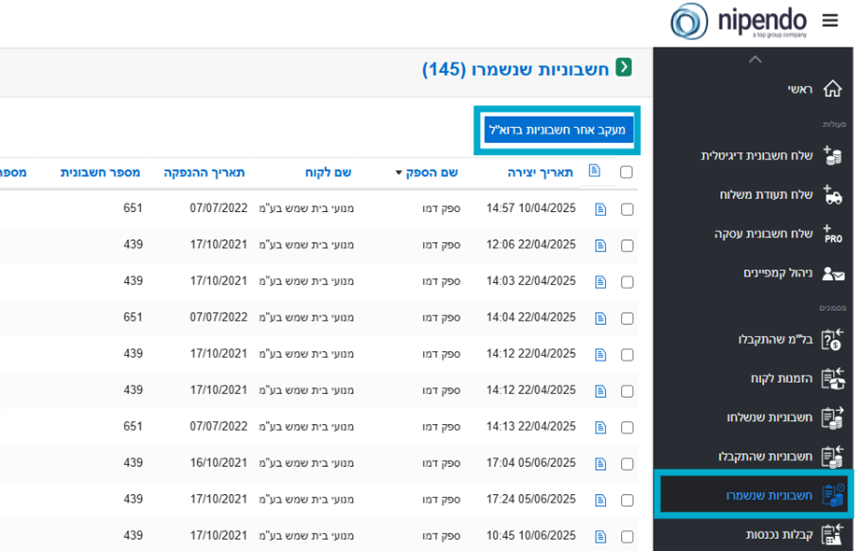 כפתור זה מאפשר לכם לראות את כל החשבוניות שנשלחו למייל שלכם, כולל אלו שנכשלו או לא נקלטו כראוי.