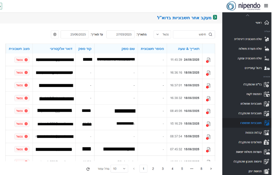 לאחר שהספקים שולחים את החשבוניות לכתובת המייל הייעודית, תוכלו לעקוב אחר החשבוניות שהתקבלו ולזהות אם היו תקלות או שגיאות בתהליך השליחה.