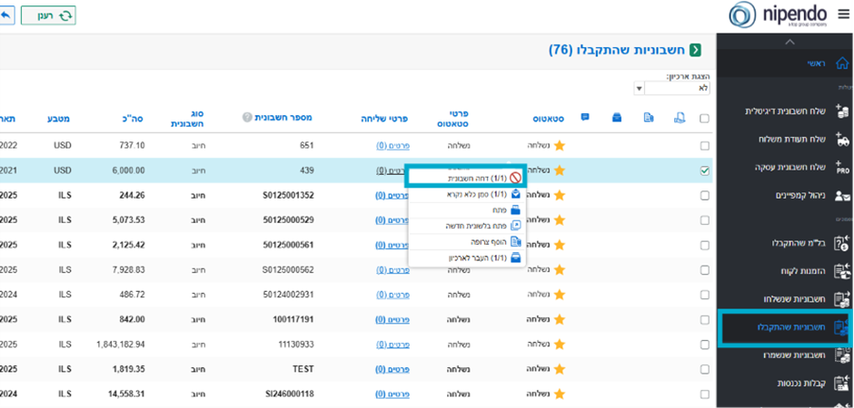 שלב 7: דחייה ידנית של חשבוניות במערכת