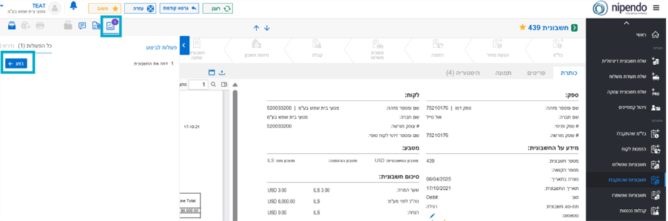 • לחצו פעמיים (לחיצה שמאלית כפולה) על החשבונית כדי להיכנס למסך הפרטים שלה