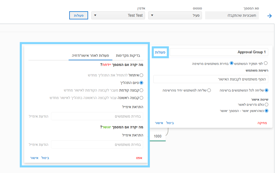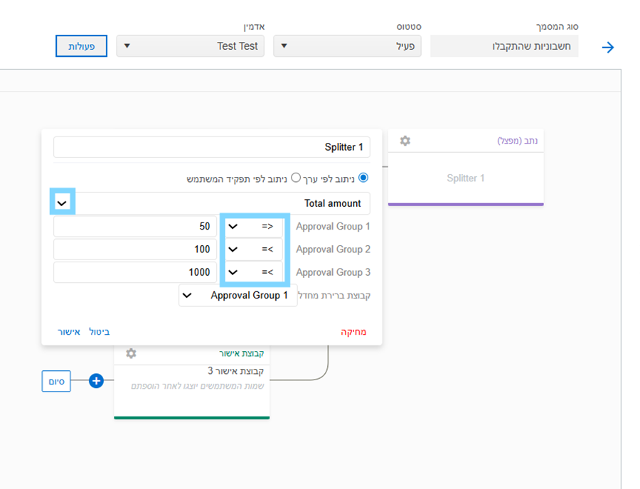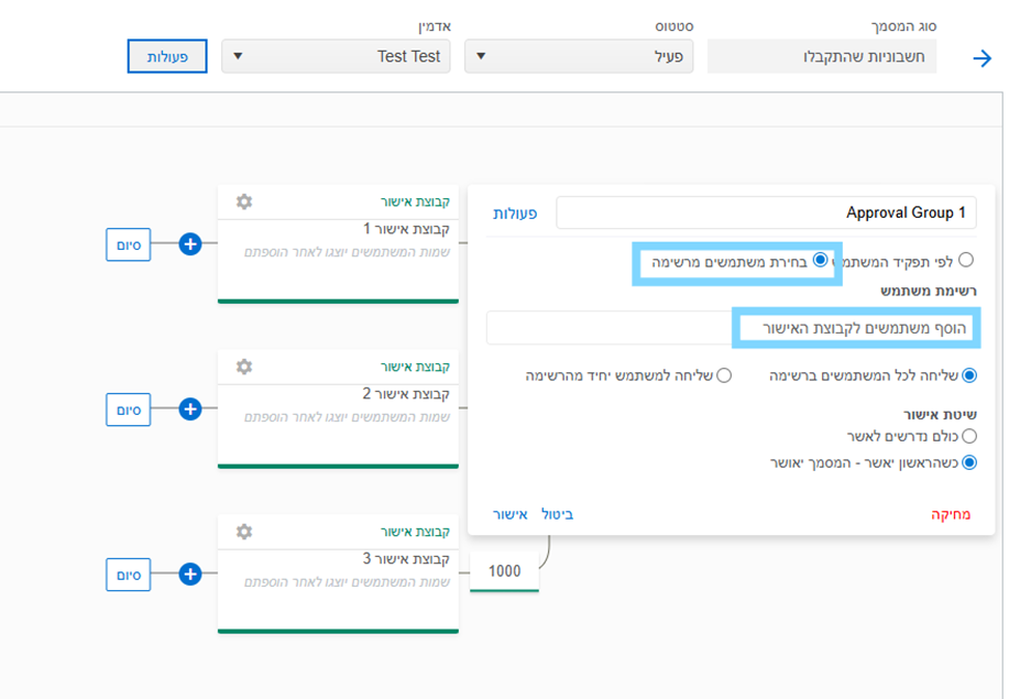 3. קבוצת אישור שתקבל את החשבונית בתנאי שהסכום שלה ≤ 1000