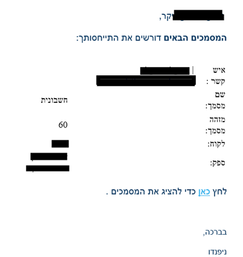 • כאשר חשבונית מגיעה לגורם מאשר, הוא יקבל התראה במייל עם בקשה לאישור המסמך. שתראה כך-