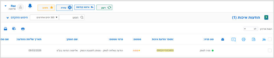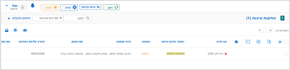 כאשר בשדה הסטטוס מופיע הסימון "פתוחה" ובפרטי הסטטוס מצוינת "הודעה נשלחה לספק - ממתין לתגובת הספק" או "דחיית תשובת ספק" נדע שעלינו להיכנס להודעת האיכות ולהגיב עליה: