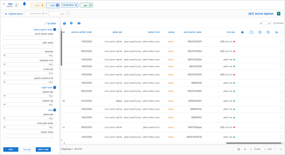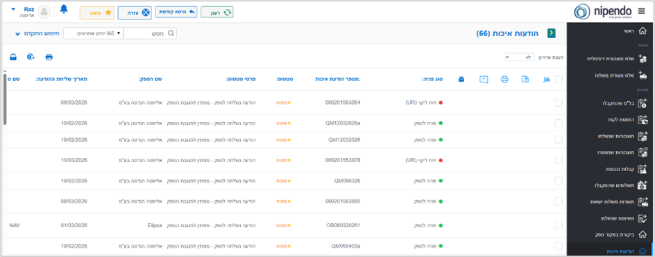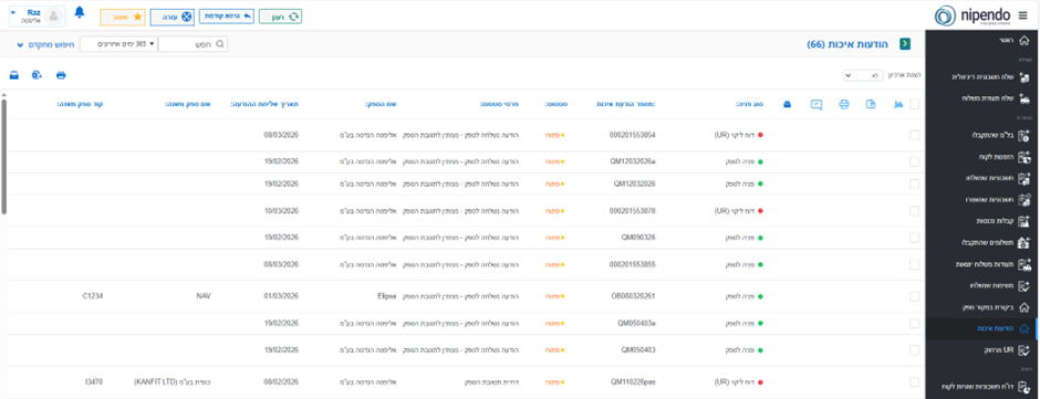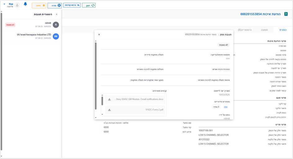 עם משלוח הודעת איכות על ידי הלקוח, יישלח מייל התראה לספק. התגובה להודעה תתבצע באמצעות הפורטל. בכדי לצפות בהודעות האיכות ניכנס ללשונית "הודעות איכות":