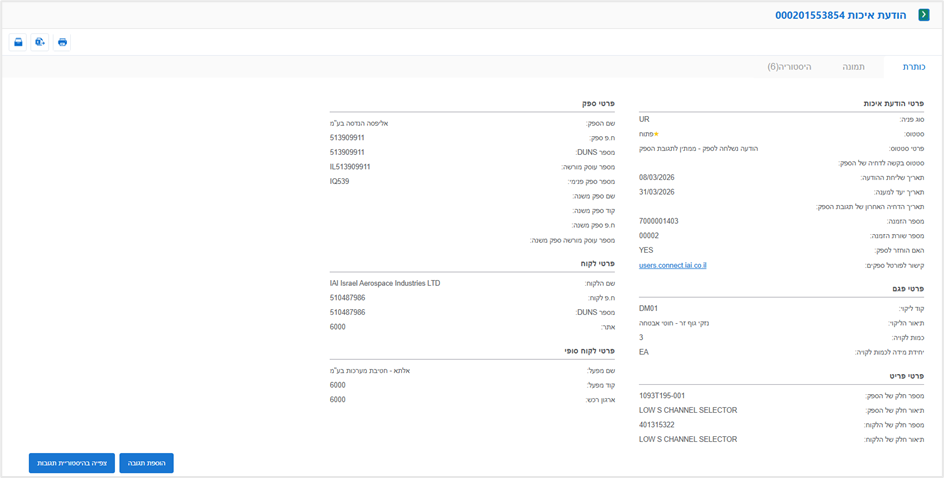 בכדי לצפות בתגובות להודעות איכות ששלחנו/ IAI שלחה אלינו נלחץ על הלחצן "צפייה בהיסטוריית תגובות"