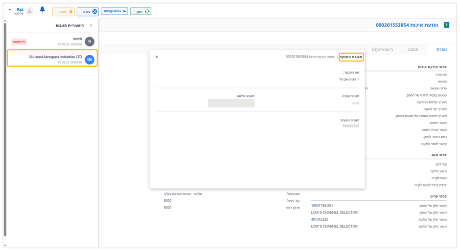 משמאל יפתח חלון ובו כל היסטוריית התגובות ששלחנו/ קיבלנו מ-IAI, מסודרות לפי סדר כרונולוגי, לצפייה בתגובה נלחץ עליה.